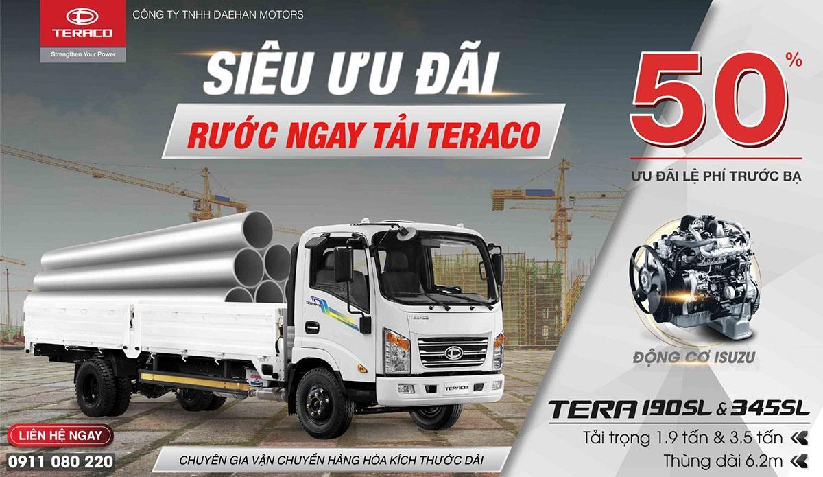 Cụ thể, mức hỗ trợ 50% lệ phí trước bạ được áp dụng cho tất cả khách hàng trên toàn quốc khi mua các dòng xe TERA100, TERA180 & TERA150, TERA350, TERA190SL & TERA345SL. Ngoài ra, khách hàng tại khu vực miền Bắc (*) còn được nhận ngay phiếu nhiên liệu trị giá 3.000.000 đồng khi sở hữu xe tải van TERA-V. Chương trình được triển khai từ ngày 1/11 – 30/11/2022 tại hệ thống Đại lý ủy quyền chính thức của Daehan Motors trên toàn quốc.